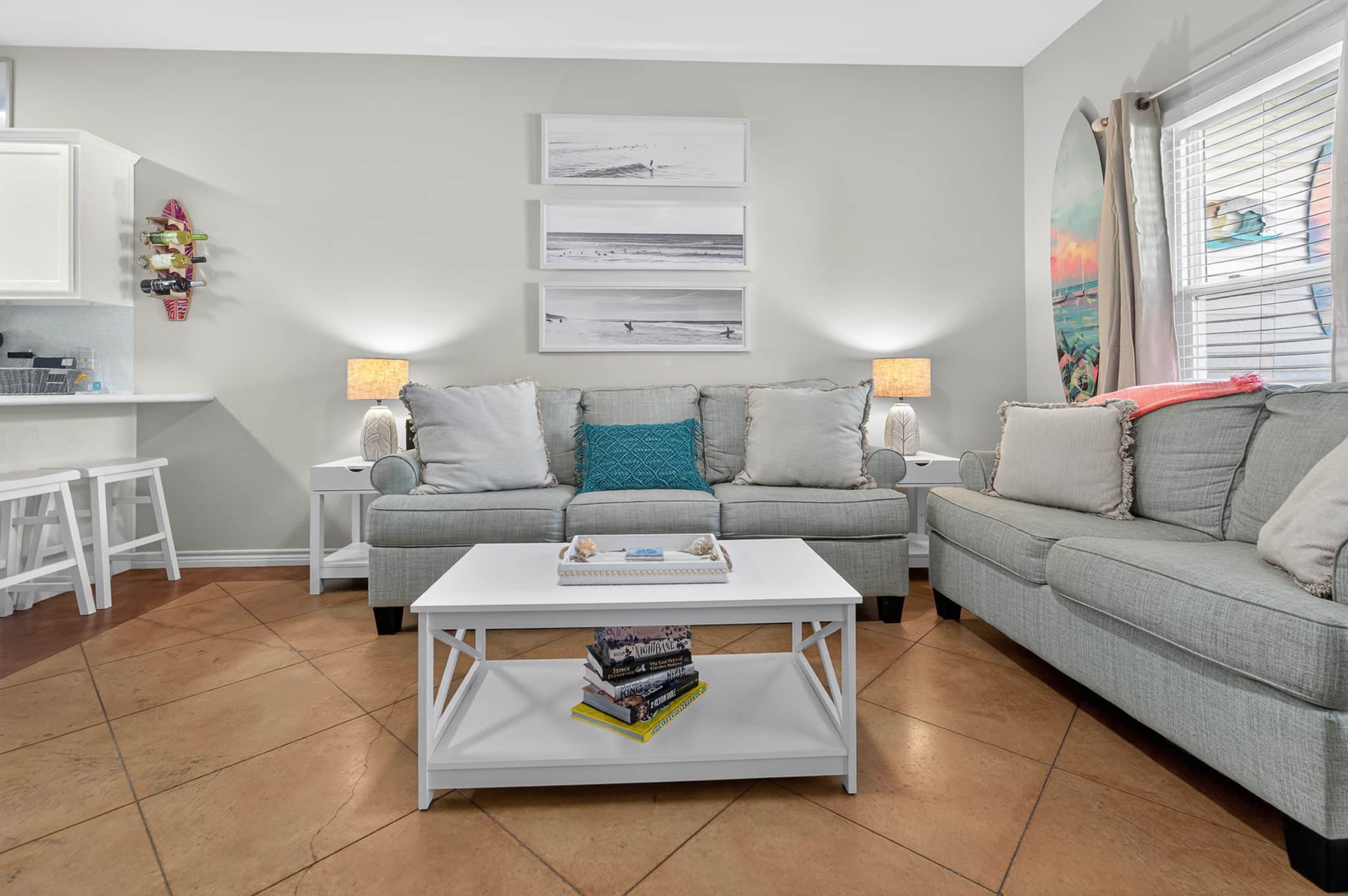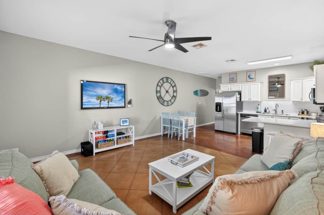 Open floor plan for everyone to enjoy. A flat screen TV with Roku, board games, puzzles and books provided for entertainment of all ages. The couch turns into a pullout queen bed.