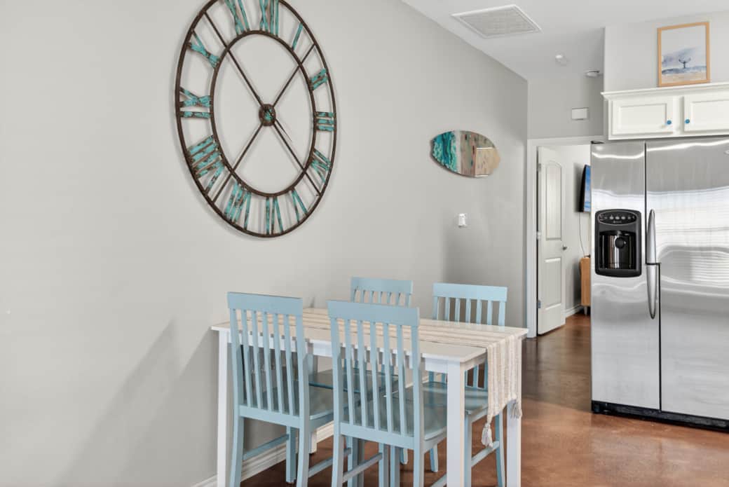 Offers a fabulous-equipped kitchen with all essentials needed for your stay. The dining table can seat 4 and the kitchen island can seat 2. Morning coffee will be a drip coffee with filters, ground coffee, creamer, and sugar provided.